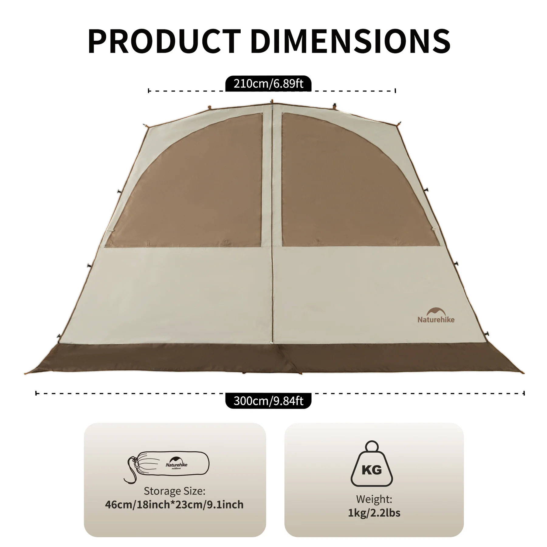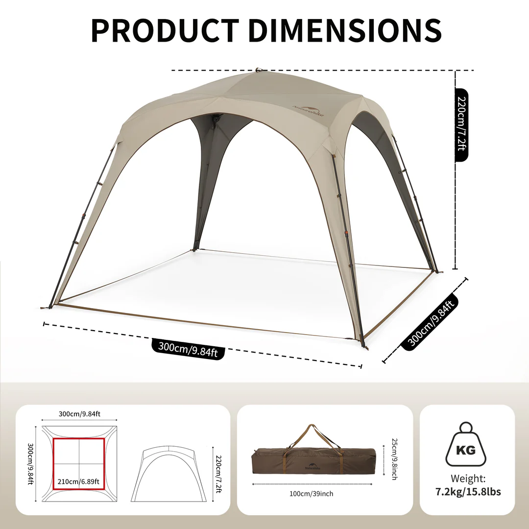 سایبان نیچرهایک با ابعاد ۳۰۰×۳۰۰×۲۲۰ سانتی‌متر طراحی شده و با ظاهر ساده، شیک و خوش‌فرم خود در هر محیطی—from جنگل و دریا گرفته تا کویر—یک فضای دلنشین برای استراحت و دورهمی ایجاد می‌کند.