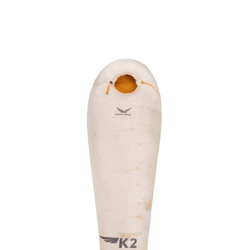 عایق کیسه خواب SnowHawk مدل K2 900 با کیفیت ترین نوع پر (پر غاز سفید) با تراکم ۹۰/۱۰ با درجه پف شوندگی ۷۰۰FP می باشد کیسه خواب پر اسنوهاوک مدل K2-900 به نحوی طراحی شده که موجب به هدر رفتن گرمای بدن نخواهد شد. کلاه خوب این کیسه خواب تمام سر شما را می پوشاند، گرما را حفظ می کند و به شما اجازه می دهد که آزاد باشد تا راحت تنفس کنید یکی از ویژگی های مهم این کیسه خواب پارچه آن می باشد پارچه این محصول ساخت شرکت KOLON کره ی جنوبی می باشد که علاوه بر سبک بودن مقاومت بسیار بالایی را در برابر پارگی و پوسیدگی دارد آستر داخلی آن نیز بسیار لطیف بوده و با پوست بدن سازگاری مناسبی دارد . همچنین زیپ و کلیه یراق آلات این محصول ساخت شرکت YKK می باشد. داخل کیسه خواب در قسمت پشت زیپ یک کانال پر وجود دارد تا سرما از قسمت زیپ به داخل نفوذ نکند.